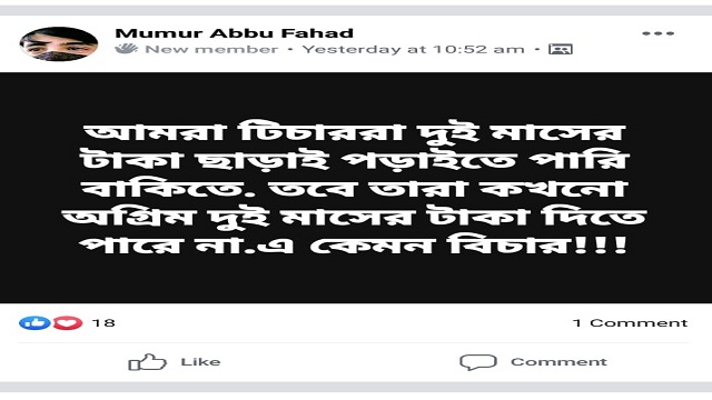 তাঁর স্ট্যাটাসে শিবলী নোমান নামে একজন কমেন্টস করেছেন, আপনারা সংগ্রাম করেন। মিছিল বের করেন যে, ‘টিউশনির টাহা লই, সোদর বোদর সইলতো নো।’ মো আশরাফুলে ইসলাম নামে একজন বলেছেন, মানুষ এমন কেন?ওদের কি আল্লাহ মানুষের মন বুঝার মত ক্ষমতা দেয় নি?।